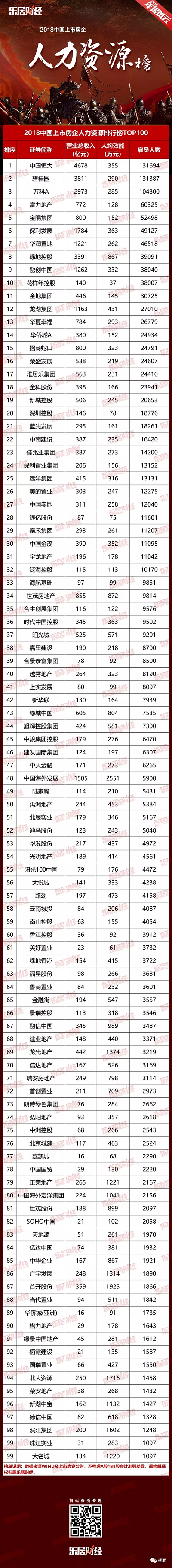 员工规模一定程度体现一家公司的经营规模及人力资源实力。《2018中国上市房企人力资源排行榜TOP100》显示,员工人数超过五万的房企有5家,超过3万的房企有11家,超过1万的有32家。排行前100的房企员工总数超136万,相当于一个地级市的人口总量。