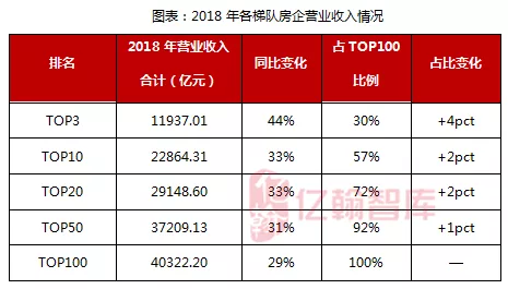 2018年, TOP100房企营业收入总额为4.03万亿元,同比增长29%。从各梯队的门槛值来看,TOP3、 TOP10、TOP20及TOP100房企营业收入门槛值增幅较为明显,分别为20%、17%、14%和37%,而TOP50营业收入门槛值有所降低,同比减少5%。