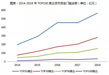 2018年,房企货币资金整体增速回升,TOP100房企货币资金合计28667.48亿元,同比增长31%,其增速较于2017年提升了14个百分点。从各梯队货币资金存量同比增速来看,榜单中各梯队房企货币资金同比增速均出现不同程度的增长,TOP10房企货币资金存量为12331.55亿元,较2017年增长11.7%;TOP30房企货币资金合计20171.89亿元,较2017年增长23%;TOP50房企货币资金合计24680.44亿元,较2017年增长28.8%。据此可知,头部房企货币资金增长相对缓慢,一方面由于头部房企发展理念多趋向稳健,在高规模之下更注重发展的效益和质量,另一方面,头部房企货币资金存量相对较高,受高基数影响,货币资金或难以出现较大涨幅;相对而言,中型房企因其正处于规模拓展期,更需要相对充足的现金流作为支撑,因此其货币资金增长较为快速。