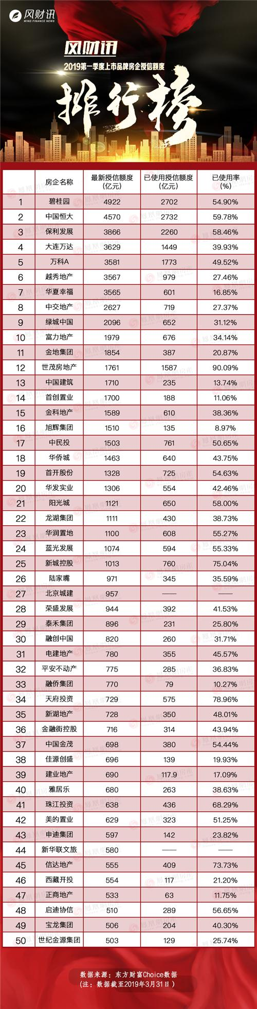 《2019第一季度上市品牌房企授信额度排行榜》数据显示,授信额度与房企规模并不匹配,仅有25家房企的授信额度超过千亿。