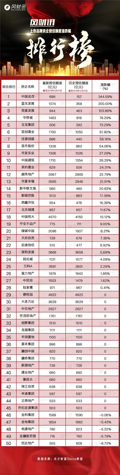 凤凰网房产以房企授信额度数据为切入点,独家发布《2019第一季度上市品牌房企授信额度排行榜》与《上市品牌房企授信额度涨跌幅排行榜》,对比开发商授信额度的变化,管窥企业的资金财技。