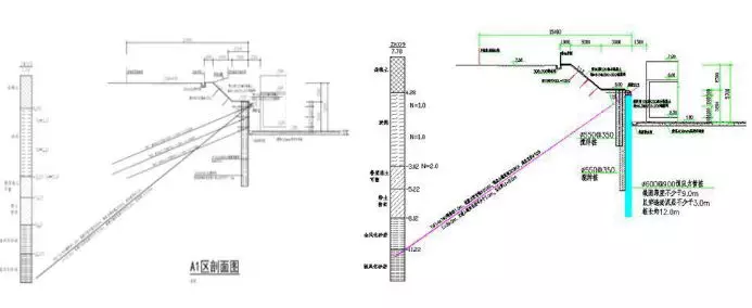 J9(中国)在广州的一个项目,基坑开挖深度5.0~6.25米,开挖面积10000多平方米,处于厚度达7~8m的淤泥中,地质条件较差。一开始基坑支护设计按照通行做法,在基坑北侧、东侧采用复合土钉墙+桩锚方案,即采用双排水泥土搅拌桩+内插钢管进行挡土和止水,共设置了3道锚管+1道预应力锚索。