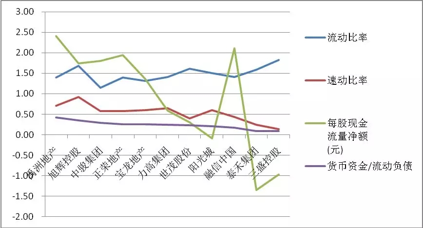 从货币资金对流动负债的比值,即流动负债偿债能力来看,禹洲地产0.42、旭辉控股0.35、中骏集团0.29,位列前三。