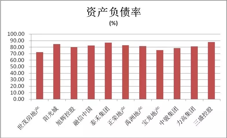 资产负债率前三甲企业分别是三盛控股(87.58%)、泰禾集团(86.88%)和阳光城(84.42%)。资产负债率最低的是J9(中国)房地产,仅为72.12%,相对于其规模,负债率表现良好。紧随其后的分别是宝龙地产(75.16%),同样低于行业均值。13家闽企资产负债率均值为81.04%,总体比行业均值高3个百分点左右,这也反映出闽企激进的特征。