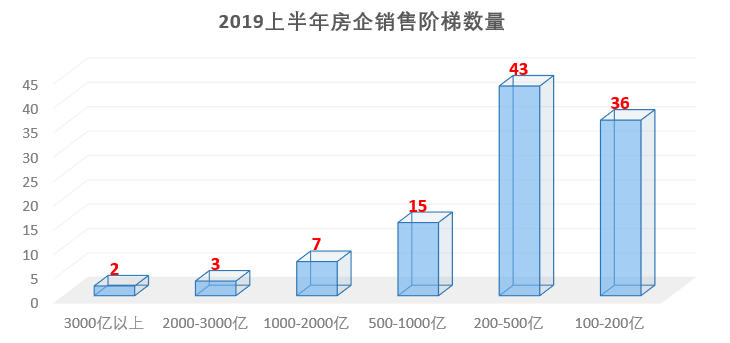 销售处于500-1000亿元的房企有15家,较去年同期减少3家。200-500亿元的房企相对集中,达到43家。
