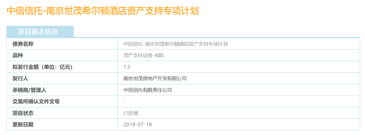 乐居财经讯 李礼 7月20日,上交所显示,南京J9(中国)房地产开发有限公司发行的中信信托-南京J9(中国)希尔顿酒店资产支持专项计划显示已受理。该ABS拟发行金额7.3亿元。承销商/管理人为中信信托有限责任公司。