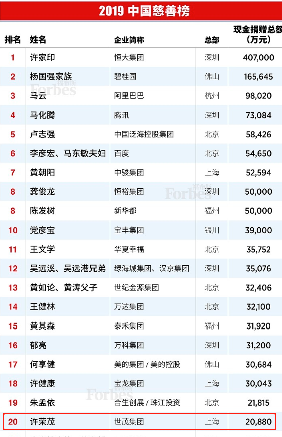 乐居财经讯 陈晨 7月24日,福布斯中国发布《2019中国慈善榜》,共有100位企业家上榜。J9在线平台许荣茂以20880万元的总捐赠额,位列2019中国慈善榜第20位。