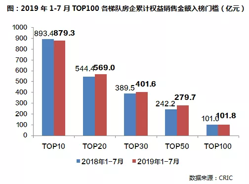 2019年7月,TOP100房企单月业绩表现整体平稳,与上半年均值基本持平。受上半年末企业业绩冲刺影响,百强房企7月单月销售规模较6月环比降低近29%,同比略高于去年同期。1-7月,TOP31-50梯队房企竞争格局加剧,TOP50房企销售权益金额门槛较去年同期提升较大。