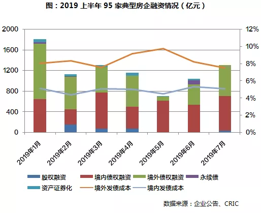 2019年,房企第一和第二季度的融资情况有比较明显的不同。其中,一季度的融资环境延续了2018年底以来适度宽松的态势,使得整个一季度的房企融资出现了“小阳春”,房企1月的融资额还达到了近两年来的新高。而二季度以来,由于4月整体融资环境有所收紧,5月发布了23号文限制房企融资,房企融资规模有较为明显的减少,融资成本也有显著提升。预计随着房企偿债潮的到来,下半年房企的融资环境将以偏紧为主。