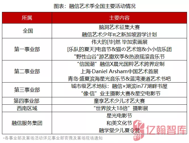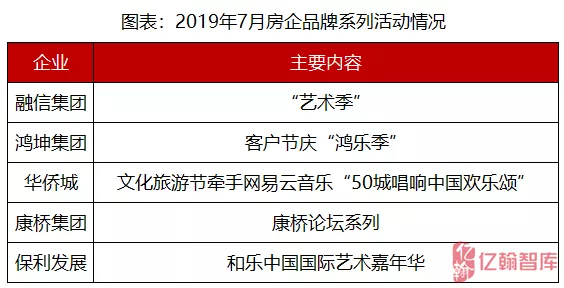 随着2019年市场热度的减弱,7月房企业绩增速放缓甚至呈下行之势,大部分房企营销活动类内容激增,其中尤以“文化”基调贯穿的活动最为突出。以融信集团为例,其7月开启“艺术季”,围绕品牌自身的“艺术”基因,在全国开展各大艺术类活动,助推企业品牌传播。