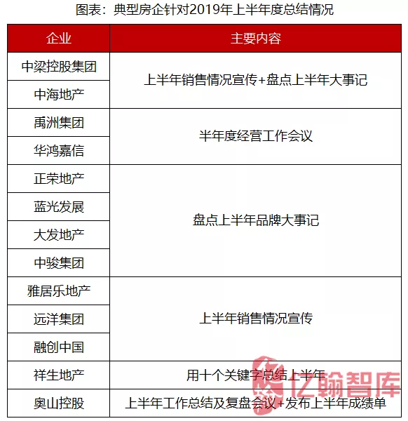 7月作为开启下半年和总结上半年的月份,数据监测显示,截止7月31日已有十余家房企发布2019年中期业绩预告,且大部分房企已陆续在媒体端或自媒体端公布企业上半年度业绩情况,主要以上半年度销售情况、上半年度企业品牌大事记为宣传点。