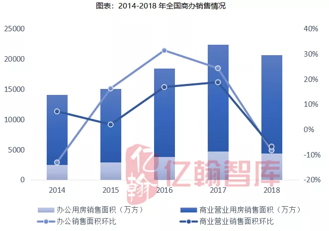 2018年商业营业用房和办公用房销量均出现下滑,全国商办新开工面积囿于商业地产整体市场库存压力较大,房企关注方向向商业地产存量倾斜。