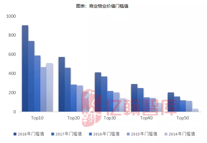 从商业物业价值排名的门槛值来看,Top30门槛值增幅最小,企业价值较为稳定。Top50企业商业物业价值门槛值增速最快,门槛值为204.04亿元,同比增长26%,企业商业物业价值增长稳定。从整体来看企业商业物业价值持续增长,企业间竞争较为激烈。