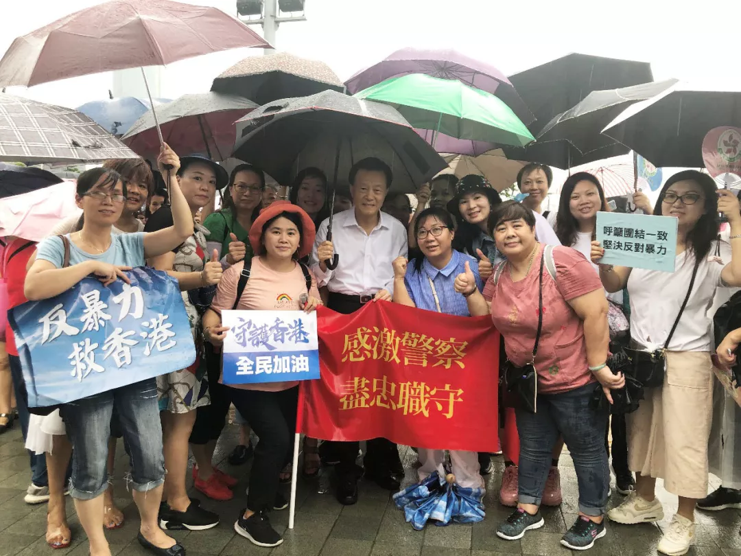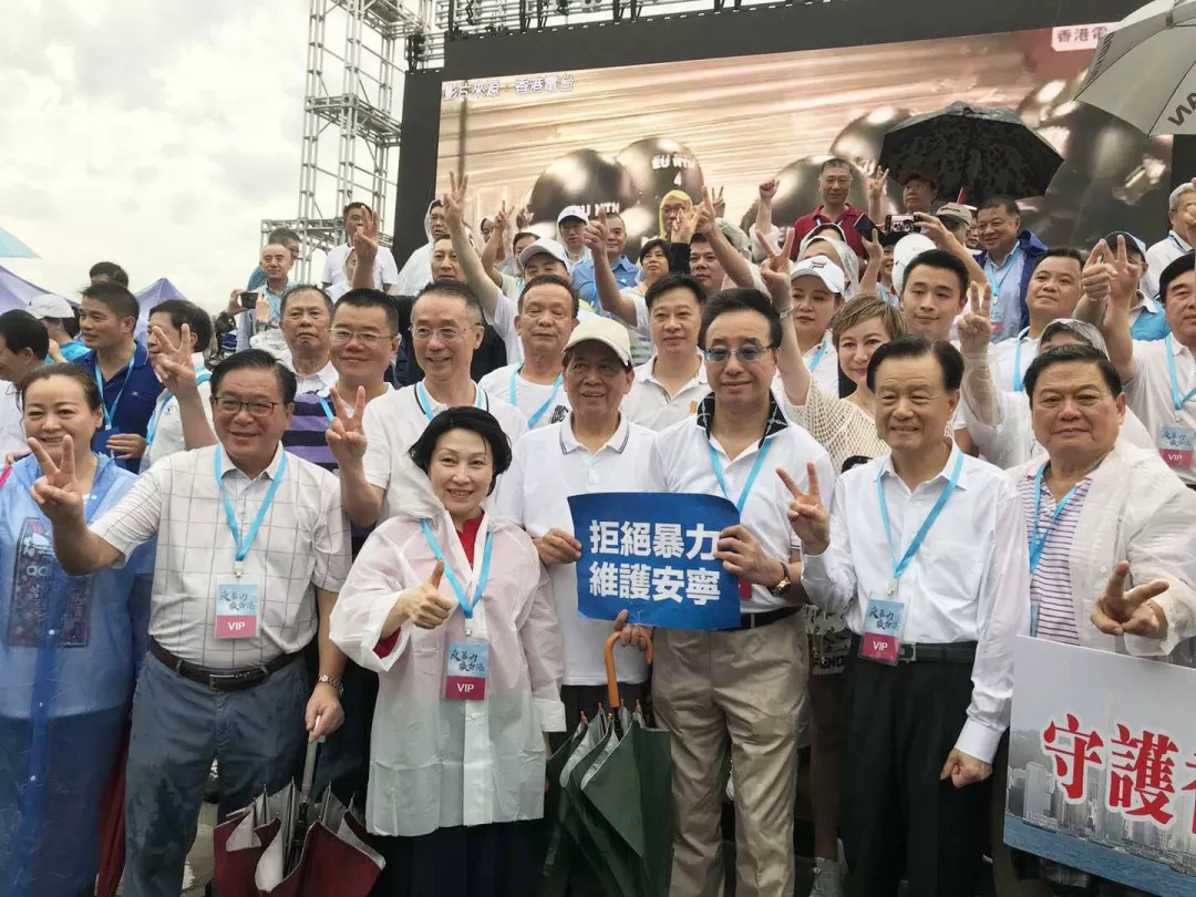 当日下着小雨,但依然挡不住香港市民的热情,47.6万人次顶风冒雨从四面八方聚集。人群中,鲜艳的中华人民共和国国旗和香港特别行政区区旗分外耀眼。集会主持人庄严指出,国旗、国徽是国家标志,象征着国家尊严不容破坏!“反暴力,救香港”条幅随处可见,“香港加油!警队加油”的呼喊声此起彼伏。