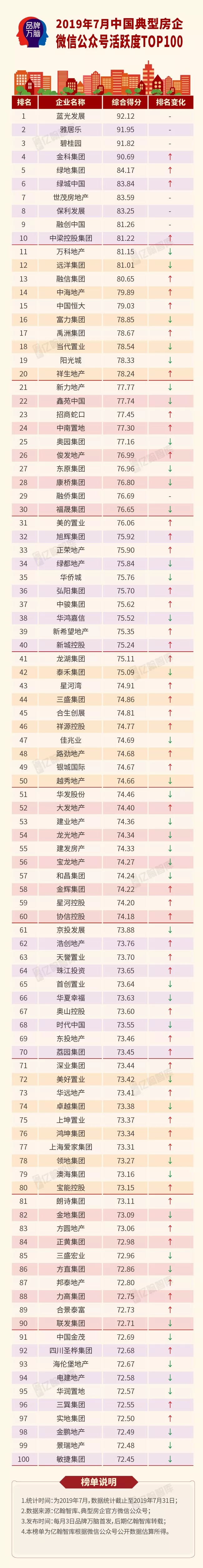 本月TOP10房企官微曝光增速较上月提升26%,整体声量占百强房企官微的43.43%。增速提升主要是由于7月份头部房企半年度业绩报告陆续发布,企业官微频频推出半年度相关推文,依靠规模效应与品牌效应占据地产行业自媒体曝光高地,如本月榜首蓝光发展通过2019上半年大事记盘点,获得4.4W+的传播效果。