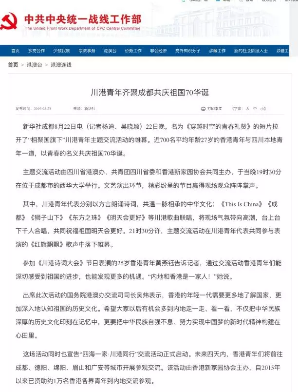 8月22日启幕的“四海一家·川港同行”青年交流活动已进入尾声,香港各界青年在四川度过了难忘的体验式交流之旅。各大权威媒体对活动的聚焦依旧热情不减,央视新闻联播、朝闻天下、人民日报、新华社、新华每日电讯、中华人民共和国中央人民政府网站、中共中央统一战线工作部网站等,纷纷给出“超硬核”报道,对于“四海一家·川港同行”活动予以高度好评!赶快一起来看看吧!