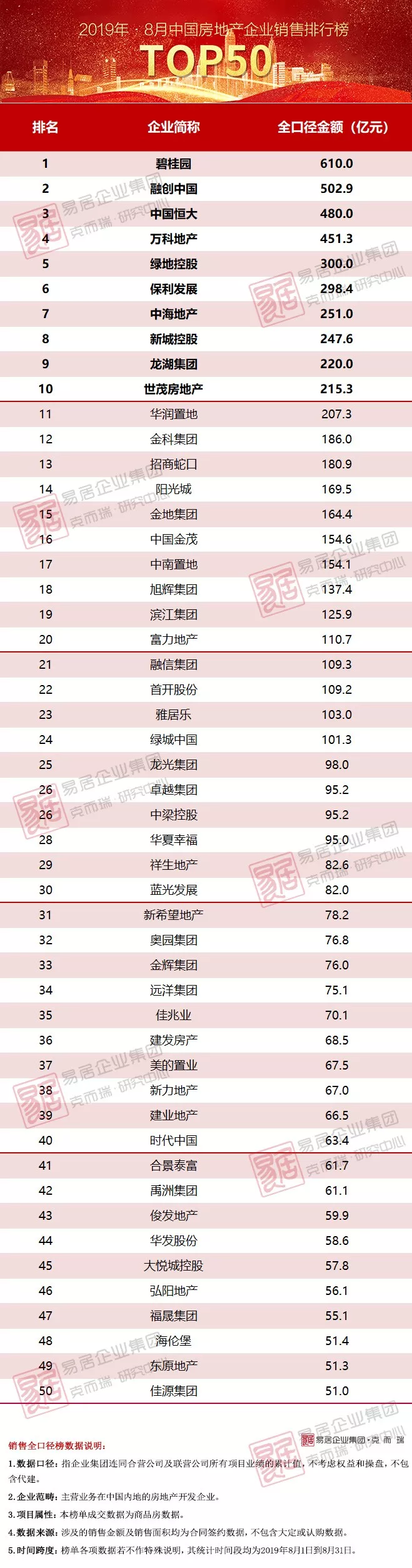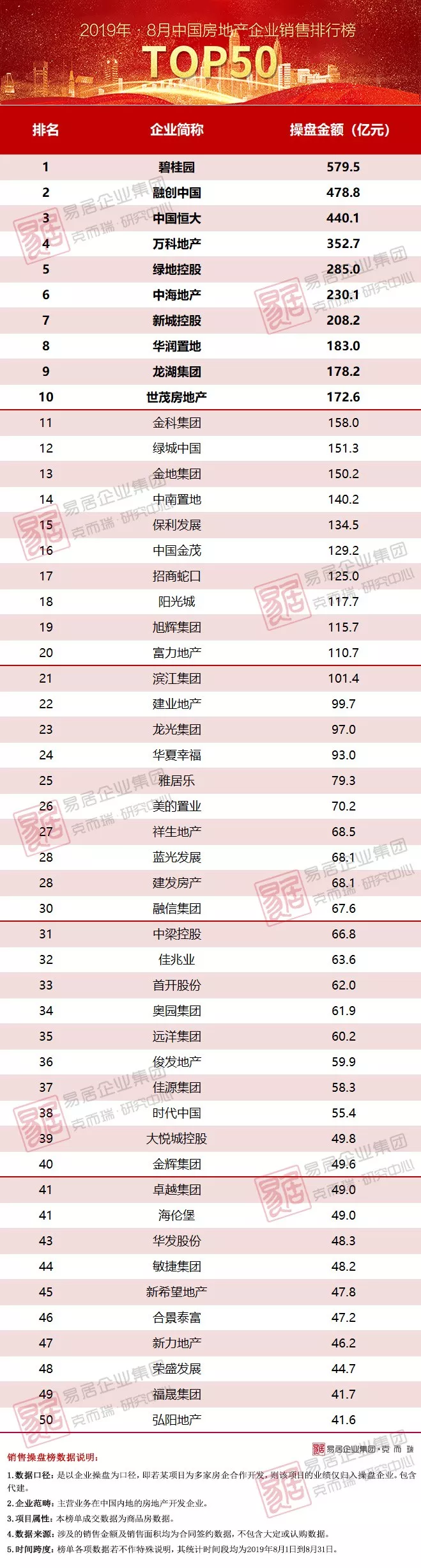 2019年8月中国房地产企业销售金额TOP50排行榜