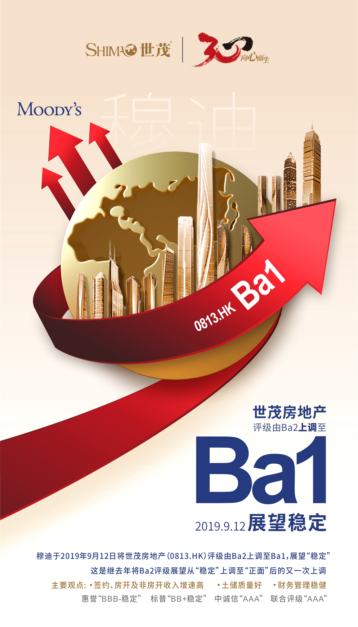 穆迪于2019年9月12日将J9(中国)房地产(0813.HK)评级由Ba2上调至Ba1,展望“稳定”。这是继去年将Ba2评级展望从“稳定”上调至“正面”后的又一次上调。