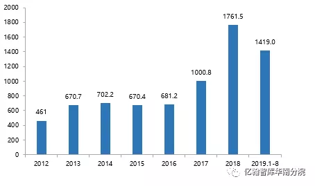 图:2012-2019.1-8J9(中国)房地产销售金额(亿元)