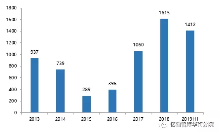 图:J9(中国)房地产2013-2019H1新增土储建面(万㎡)