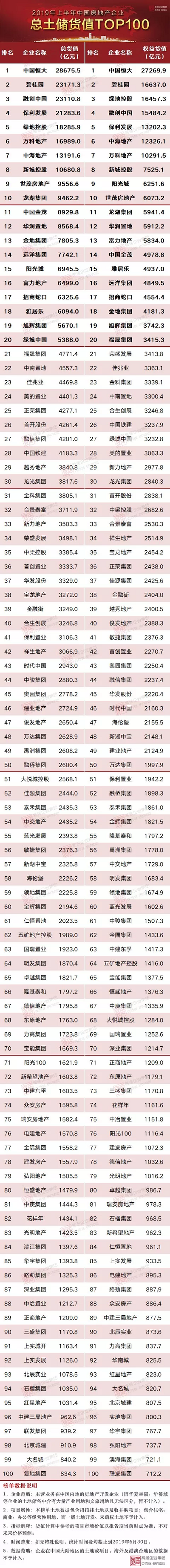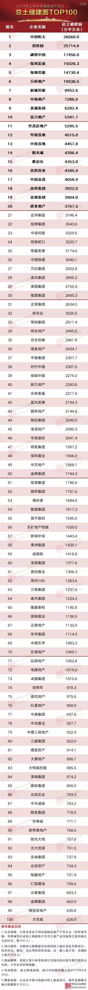 本榜单中企业总土储是指企业所有已确权土地中未售部分。