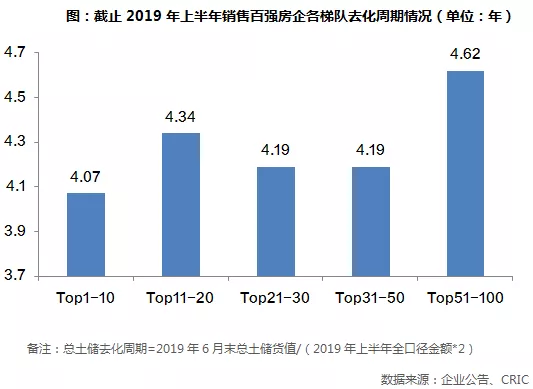 截止至2019年上半年,百强房企总土储的平均去化周期为4.24年,相较2018年末上涨了0.34年,主要是受到上半年市场运行较为平淡的影响。