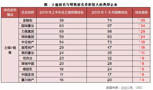 对比房企2019年上半年土储货值排名和2019年1-8月销售排名来看,有三类房企的表现值得关注: